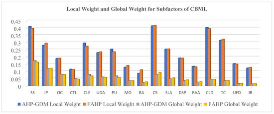 The help of DMs was sought during the shortlisting of the main factors and subfactors of CBML. As per the AHP-GDM and FAHP steps discussed in the previous section, they were carried out to obtain various matrixes, tabulated in Table 5, Table 6 and Table 7. Table 8 shows the weight of the value after synthesizing all the values of the three decision matrices using the geometric mean. Local weights were obtained to provide the priority of subcriteria, whereas global weights provided the overall priority of main CSFs of CBML. Furthermore, a pairwise comparison of different main factors and subfactors was also carried out. The composite weight of all main factors and subfactors of CBML was obtained through the AHP-GDM, as shown in Table 9.