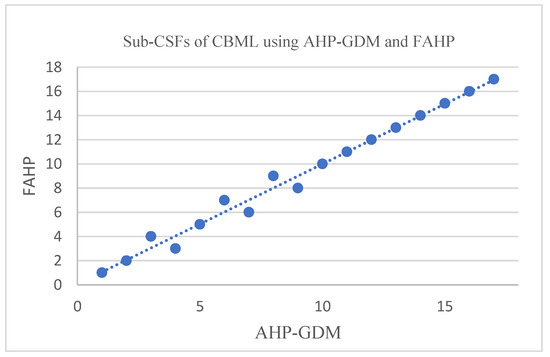 Decision makers for CBML administrative readiness or stakeholders may use the present analysis for understanding CSF and their roles in successful CBML implementations. The ranking obtained through AHP-GDM and FAHP could enable university authorities to understand the critical role being played by each CSF in successful CBML implementations. Further analysis carried out in the present research direction will also help stakeholders to identify and control strategies for effective usage. The ranks obtained by AHP-GDM and FAHP were compared using the Spearman global rank coefficient, which was obtained as 0.992647. The Spearman global rank coefficient is shown in Figure 7. Values closer to 1 demonstrate a more perfect association between the ranks. The rankings of subcriteria of CBML using AHP-GDM and FAHP were nearly the same, indicating consistency in decision making. Thus, it showed nearly perfect positive connotation of ranks.