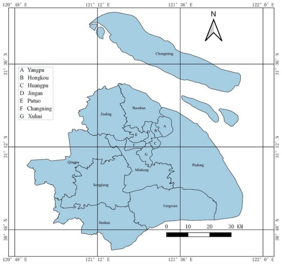 Shanghai is located in the eastern coastal zone of China, bordered by the East China Sea to the east, Jiangsu Province to the northwest, and Zhejiang Province to the southwest, at 120°51′–122°12′ E longitude and 30°40′–31°51′ N latitude (Figure 1). It is on the alluvial plain of the Yangtze River Delta, with a low average altitude. The city’s climate is subtropical monsoon, with an average temperature of 17.8 °C in 2020, a sunshine duration of 1839.4 h, and annual precipitation of 1660.8 mm. In 2020, Shanghai’s gross domestic product (GDP) reached 3.87 trillion CNY, accounting for 3.84% of China’s GDP. The city has a population of 24,883,600 and a population density of 3925 people per square kilometer.