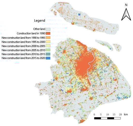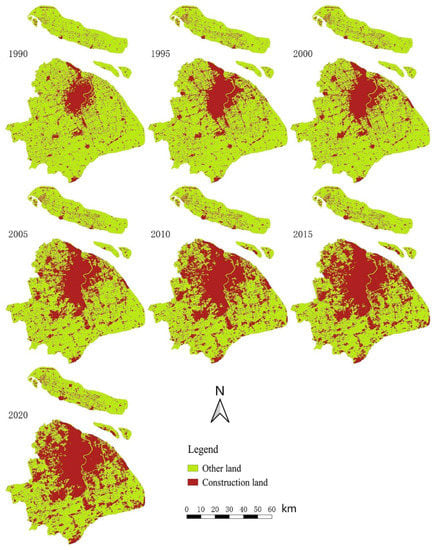 Based on the calculation results of NDBI and NDVI, the low-density vegetation cover area was eliminated to obtain urban construction land. However, in this method, the extracted results still contain information on urban unused land. Due to the small number of unutilized urban areas in Shanghai, unutilized urban areas in Shanghai are eliminated by visual recognition. Notably, the spatiotemporal consistency of classification results in different research periods is one of the difficulties in developing land use products [71]. It will impact the analysis of temporal changes in land use, so visual identification is used to test the consistency of temporal changes in the classification result map of construction land.