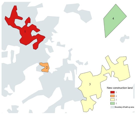 where S represents the common edge measurement index, IC represents the length of the common edge between the new construction land and the existing construction land, and I is the edge length of map spots used for new construction land. When S ≥ 0.5, internal filling expansion occurs. When 0 < S < 0.5, it is an urban sprawl. When S = 0, it is an enclave expansion [74,75,76,77].