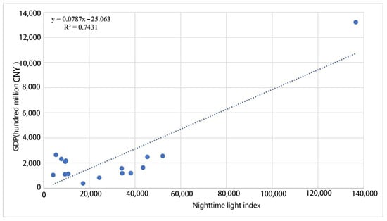 Figure 7 is a scatter plot of GDP data and nighttime light data of 16 districts in Shanghai in 2020. Since the GDP and nighttime light index of the Pudong New Area are much higher than those of other districts, they are far from other points. The correlation coefficient between GDP and nighttime light data was 0.8624 according to linear regression, and the goodness of fit of the equation after linear regression was 0.7431. Both the correlation coefficient and goodness of fit proved that nighttime light data and GDP had a strong correlation.