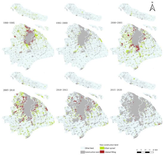 According to the time intervals of 1990–1995, 1995–2000, 2000–2005, 2005–2010, 2010–2015, and 2015–2020, through the superposition analysis of images at different periods and the grid calculator, the construction land area and newly added construction land area of the study period were obtained (Figure 3). Based on map spot information of the newly added construction land, according to the latter’s position relationship with the existing construction land, it can be approximately divided into the following four cases (Figure 4): (1) The new map spot is located in the existing built-up area of the city, which is the utilization of the blank land inside the urban built-up area (a red patch in Figure 4). (2) The newly added map spots are located at the edge of the existing construction land in the city but are more connected with the existing construction land, and the public contact surface is large (orange patch in Figure 4). (3) The new map spots are located at the edge of the existing construction land in the city, and they interface with the existing construction land, but the adjacency degree is small (yellow patches in Figure 4). (4) The new map spot is located in the nonurban construction site and has no contact with the existing urban construction land (green patch in Figure 4). Given these cases, we believe that the first and second cases are internal filling expansion, the third case is fringe sprawl, and the fourth case is enclave sprawl. In specific, only the third and fourth cases are urban sprawl.
