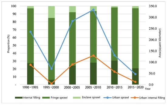 Based on the results of the current research [81,82], the paper sets the buffer distance to 1 m, calculates the new patch buffer area and the overlap area of the existing construction land and other land. The landscape expansion index of each new patch was calculated according to Formula (4). Urban sprawl and internal filling are distinguished based on the calculation results (Figure 5).