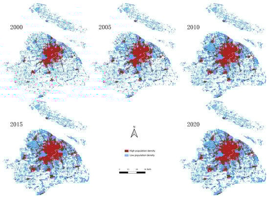 In this paper, areas with higher urban population density than the average urban population density of Shanghai are defined as urban high-density areas, while areas with lower population density are defined as urban sprawl areas. The population distribution data and urban construction land were superimposed to obtain the spatial data of population density in the area covered by urban construction land. In order to eliminate the inconsistent resolution of different datasets, we used weights to redistribute the pixel attribute values of the population density raster data according to the construction land dataset to obtain a dataset consistent with the resolution of the construction land and with both population attribute values. The population density values corresponding to the grid data of construction land in Shanghai in 2000, 2005, 2010, 2015, and 2020 were calculated according to the area sharing method. The calculation results of the mean population density values of the corresponding years are shown in Table 6.