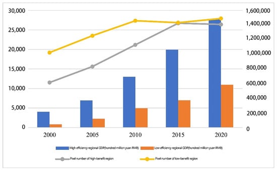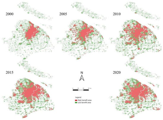 First, the nighttime light data and construction land data were spatially matched, and the nighttime light attribute value was assigned to the construction land according to the area equalization method. Next, the GDP was allocated according to the weight of the nighttime light data in the construction land to obtain the spatial data of GDP in the construction land. The threshold of land use benefit was determined by the same method as the threshold of population density. The area higher than the city’s average land use benefit was considered the high-benefit area of land use, and the area lower than the city’s average land use benefit was considered the low-benefit area of land use (Table 8).