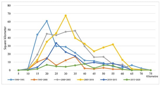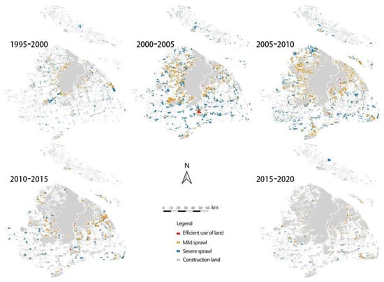 The knowledge gaps addressed in this study are as follows: (1) Previous studies mainly defined and measured urban sprawl from a single dimension such as discontinuous land use and low population density [22,23], or according to these two core characteristics. In this study, the core feature of land use efficiency was added, and the urban expansion satisfying the three core features of discontinuous land use, low population density and low land use efficiency was defined as urban sprawl. Although there were some previous research results with three dimensions, the third dimension chosen by them is either ecological index [36] or external influence [17]. We believe that ecological indicators or external influences are only external representations of urban sprawl, rather than its intrinsic characteristics. (2) The results of urban sprawl measurement largely depend on the selection of research time scale and spatial scale, and the selection of time scale is particularly important [66]. We shorten the study time interval from the usual 10 years to 5 years, which helps to more accurately identify the discontinuous information of land use patches. Through time series analysis, we found that the effective supply of housing significantly affected the intensity and scale of urban sprawl but not the speed of urban sprawl in Shanghai metropolitan area. (3) Compared with previous studies, we added analytical dimensions such as sprawl direction, sprawl distance and regional heterogeneity, and more finely identified the dynamic evolution characteristics of urban sprawl in Shanghai under different spatio-temporal backgrounds, such as intensity difference, direction difference and circle difference.