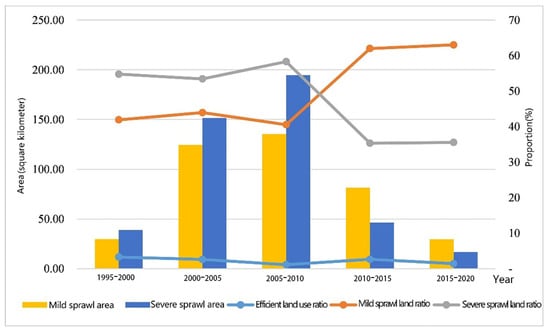- Research on the definition and effects of urban sprawl. Early urban sprawl mainly emphasized the spatial expansion of urban land, especially the discontinuous (leapfrogging) development and single-use development of suburban land [1,2]. Subsequently, the low density of urban sprawl and the incongruity of population and land expansion were gradually emphasized [3,4]. Some scholars believe that urban sprawl would lead to a continuous reduction in arable land, green space, and forest area in urban fringe areas and an increase in urban landscape fragmentation [5,6,7,8], an increase in environmental pollutants and a significant increase in carbon emissions, or a reduction in production efficiency [9,10,11]. Additionally, the impacts of urban sprawl on public health and transportation outcomes have received a lot of attention [2,12,13,14]. Several researchers combine space and connotation to define urban sprawl, believing that urban sprawl refers to low-density land use patterns in urban fringe areas that rely on car travel [15]. However, it also refers to the continuous spread of urban construction land to the outer undeveloped land in a low-density and leapfrogging manner [16]. Alternatively, it can refer to a low-density, inefficient and disorderly outward expansion form in urban development [17,18,19,20,21]. Accordingly, the common characteristics of urban sprawl are low-density and inefficient spatial expansion to urban fringe areas in a discontinuous way. In addition, urban sprawl and urban spatial expansion should be distinguished. Not all urban spatial expansions result from urban sprawl. We should neither exaggerate the extent of urban sprawl nor see only the negative effects of urban sprawl [20].