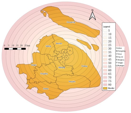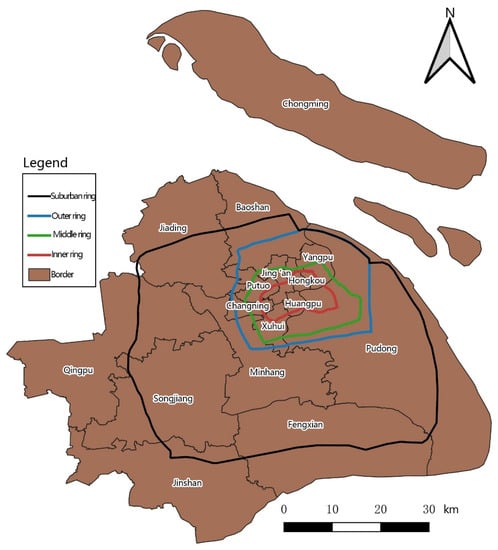 Other data are mainly statistical and spatial data. The statistical data include data on the population, economy, education, medical care, etc., captured mainly from the statistical yearbooks and statistical bulletins of Shanghai and its districts. In terms of spatial data, the vector boundary data of Shanghai are based on the boundary data of the 2017 administrative map. The spatial data of the Shanghai ring line division were obtained according to OpenStreetMap vectorization. The spatial data of traffic stations were also obtained from OpenStreetMap. The distribution data of the Shanghai development zones and water system were obtained from the Shanghai Institute of Geological Survey, while the distribution of water area was obtained from the cloud platform of the National Geographic Survey. The spatial distribution of business districts was obtained from the vectorized data of Shanghai Commercial Network Layout Planning (2014–2020). The ground elevation model (DEM) data were obtained from the geospatial data cloud platform.