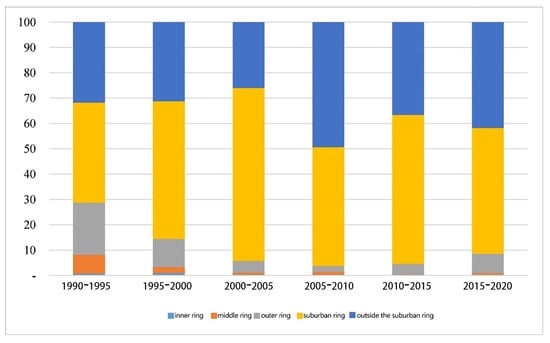 Since the 1990s, China has witnessed rapid development of industrialization and urbanization with metropolitan areas as the core. As the core city leading the world-class urban agglomeration in the Yangtze River Delta, Shanghai is not only one of the cities with the fastest economic growth in China, but also one of the cities with the largest immigrant population. It is also one of the cities with the most prominent urban spatial expansion in China [21]. Its urban expansion modes are complete and diversified, including internal filling, enclave sprawl and edge sprawl. Over the past 30 years, Shanghai has experienced the evolution from an industrial center to an economic center and then to a rising global city. In the process of transformation and upgrading of industrial structure and urban functions, Shanghai not only did not choose the deindustrialization strategy of metropolitan areas of some developed countries, but also did not appear the large-scale slum phenomenon that exists in the metropolitan areas of Latin America and other developing countries. There is a significant difference between China’s metropolitan sprawl or suburbanization and that of the West in terms of morphology and internal mechanism. China’s urban sprawl is dominated by government-guided suburban development zones, residential suburbanization is later than industrial suburbanization, and the sustained prosperity of urban central areas coexists with low-density expansion of urban periphery areas [66]. Therefore, choosing Shanghai as a case study has strong typicality and representativeness.