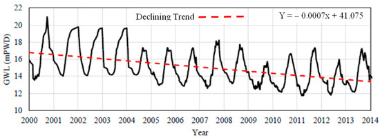 - The historical water table data of the study area revealed that the mean water table elevation had declined 0.97 m in the previous seven (07) years, which is equivalent to 139 mm/year. Though the decline rate is not particularly excessive, it still represents the alarming situation of the study area, where the per capita groundwater resources are reducing. Furthermore, the population, and thus, demand is increasing.