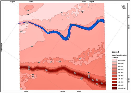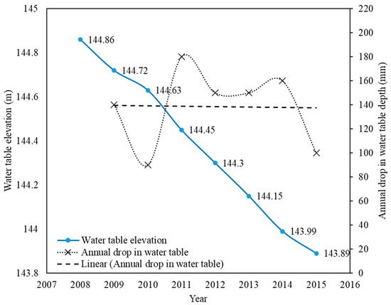The historical water table data of the study area displayed that the mean water table elevation in 2008 was 144.86 m and in 2015 was 143.89 m (Figure 4), thus showing a drawdown of 0.97 m in a total of seven (07) years; this indicates that the average decline rate in the study area during the period from 2008 to 2015 was 139 mm/year. This decline rate can be explained by several factors, including excessive water pumping during any planned groundwater-level operation; the noticeable increase in domestic needs as per the boost in built-up areas, as visualized in Figure 5b; and the region’s climate change, where rainfall events have changed dramatically. Though the decline rate is not excessive, it still represents the alarming situation of the study area, where the per capita groundwater resources are reducing, and furthermore, the population rate is increasing.