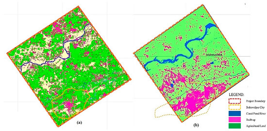 Landsat images from 1996, 2000, 2010, 2015, and 2018 were obtained with minimum cloud cover criteria. Layer stacking using a band combination of 4, 3, and 2 was carried out to obtain a multispectral image. A pan-sharpening tool was used to increase the spatial resolution of the images. The images were imported in Environment for Visualizing Images (ENVI) software, where supervised classification was performed by selecting training samples. Based on the training samples, the collected results were generated by assigning color ramps to particular feature classes. Then, the urbanized area was estimated to calculate the urbanization rate. The urban area maps for the year 1996 and the year 2018 are shown in Figure 5.