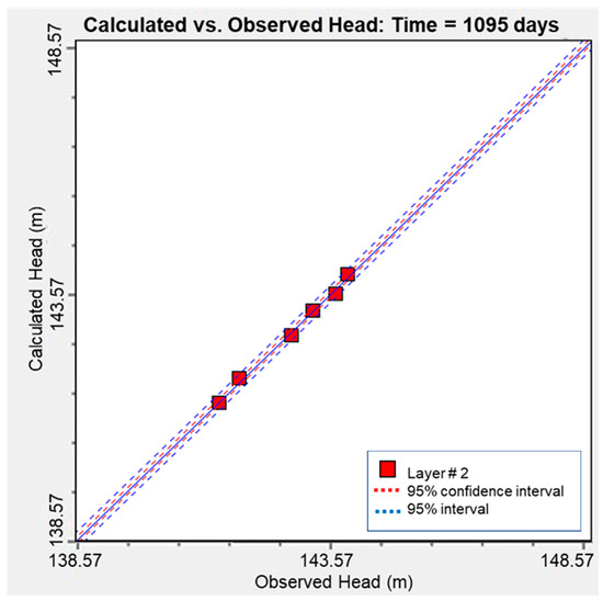 Model validation is a process by which the calibrated model is shown to be capable of reproducing a set of field observations or predicting future conditions without further adjustment to the calibrated parameters. Several researchers have argued that, at least philosophically, a groundwater model cannot be validated in the absolute sense, like any scientific hypothesis. Thus, the term "model validation" should be avoided [28]. However, the model was validated for the same four (04) piezometers using the observed head values for 2015 and 2016. The scatter graph between the observed and calculated head values shows that all the calculated values of the model are well within the 95% confidence interval, as shown in Figure 6. Figure 7 shows the head-versus-time curves for the calibrated wells. The calibration result shows that the hydraulic conductivity (K) and specific yield (Sy) of layer 1 are 4.5 × 10−6 m/s and 0.10, respectively, and those of layer 2 are 1.1 × 10−5 m/s and 0.22, respectively.