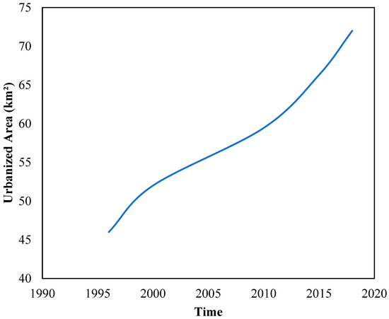The results of urbanization classification showed that the urban area in 1996 was 46 km2, and in 2018, was 72 km2 (Figure 8), thus showing an increase of 26 km2 in 22 years; this indicates that the urbanization rate in the study area has been increasing at a rate of 1.1% per year over the last 22 years. In contrast, this increase has been more pronounced, i.e., 1.62% per year for the last 8 years. Hence, the above factors reinforce each other, i.e., the increasing population and urbanization, and are contributing to the groundwater table decline.