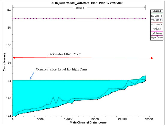 The results of the HEC-RAS model explain that for ponding up to an elevation of 148 m (a 4 m high dam), the backwater effect is up to about 25 km upstream with a lake area of 26.87 Km2. The backwater effect can be seen in the longitudinal section of the reservoir obtained using HEC-RAS, shown in Figure 9. The comparison of lake evaporation with river inflows shows that lake evaporation varies from 0.37 to 2.35 cumecs, whereas the river inflows vary from 20 to 255 cumecs most of the time. The river inflow data display that the mean annual inflow of the river is 1766 cumecs. In contrast, the mean annual lake evaporation is 14 cumecs only, which indicates that mean annual lake evaporation is about 1% of the mean annual river inflow.