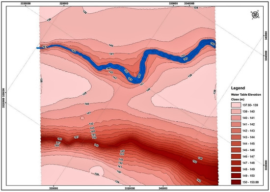 - The results of groundwater modeling for a dam ponding elevation of 148 m, in the form of groundwater contour maps after 1 year and 20 years of ponding/the simulation period, are shown in Figure 15 and Figure 16, respectively. Meanwhile, the results of groundwater modeling for a dam ponding elevation of 151 m, in the form of groundwater contour maps after 1 year and 20 years of ponding/the simulation period, are shown in Figure 17 and Figure 18.