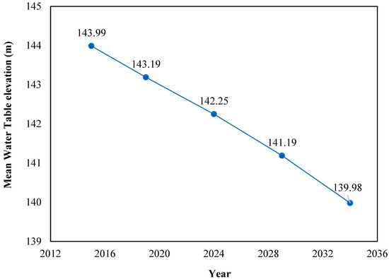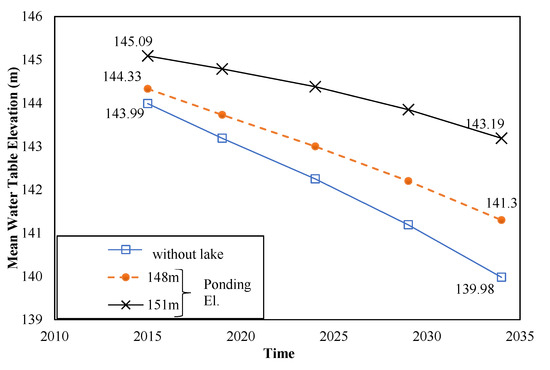 - The results of the model (Figure 19) depict that the average water table decline in the study area is expected to be reduced from 201 to 151 mm/year (ponding at EL of 148 m) and 95 mm/year (ponding at EL of 151 m).