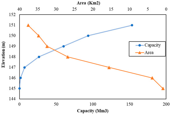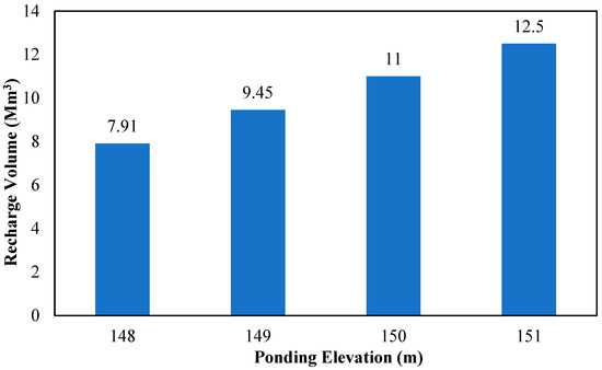 - The elevation area capacity curve for the proposed ponding through the dam is shown in Figure 13. The contribution/volume of groundwater recharge with different dam ponding elevations (148–151 m) is presented in Figure 14. The groundwater model results show that upon ponding the river from elevations of 148 to 151 m, the lake area varies from 26.8 to 37.6 km2, and its capacity varies from 26.5 to 153 Mm3, contributing a base-year recharge of 7.91 to 12.5 MGD, respectively.
