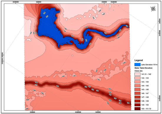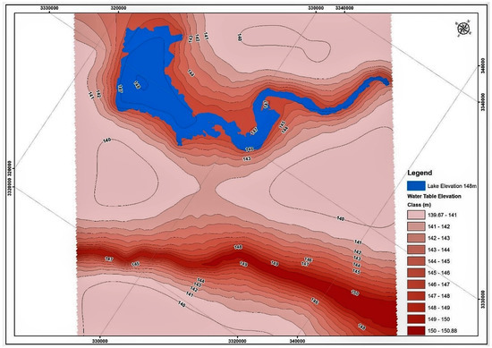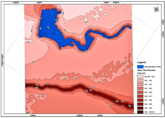Figure 15. Groundwater Contour Map Ponding at EL of 148 m after 1 year.