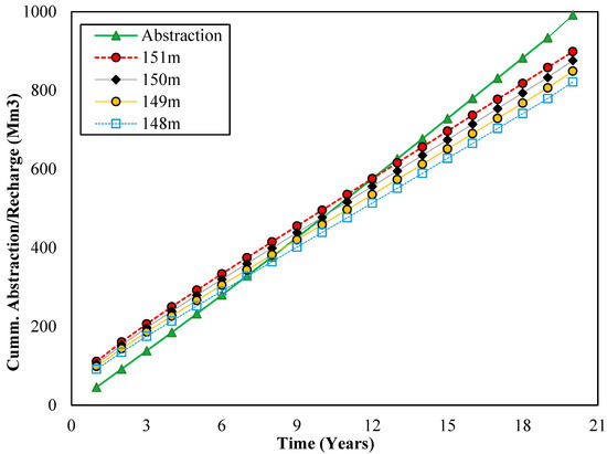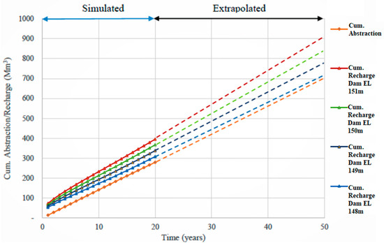 - The comparison of cumulative recharge and abstraction, as plotted in Figure 20 and Figure 21, revealed that for areas that benefitted from dam recharge, the groundwater abstraction rate will remain sustainable for more than 50 years for all the cases of ponding and for the overall study area; moreover, the cumulative abstraction will remain sustainable for 7, 8.3, 10.5, and 12.3 years in the case of ponding in the river up to elevations of 148, 149, 150, and 151 m, respectively. After that, some other recharging mechanism would be required.