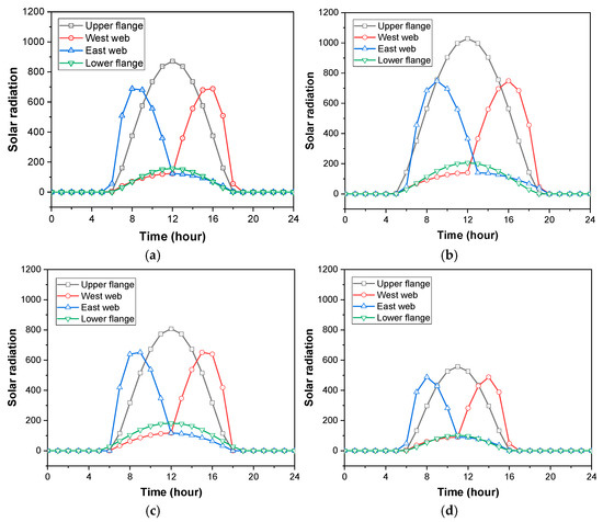 According to the Duffie model [26], the radiation from any dayside is equal to the sum of the direct radiation, scattered radiation, and ground-reflected radiation. The amount of radiation on the shadow surface is equal to the sum of the scattered radiation and ground-reflected radiation. Considering the local latitude and bridge orientation (north–south), the total solar radiation values of the upper flange, web, and lower flange in the four seasons are calculated, as shown in Figure 3 below.