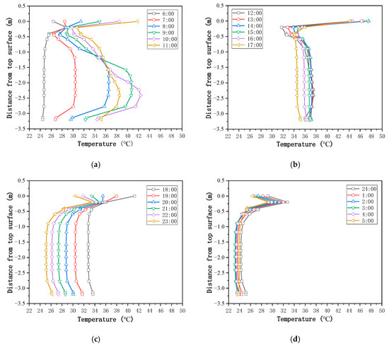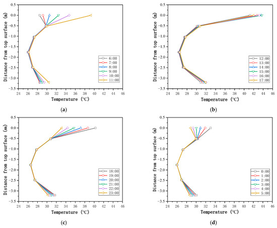 Section temperature distributions of CB in 24 h. (a) 6:00–11:00. (b) 12:00–17:00. (c) 18:00–23:00. (d) 0:00–5:00.