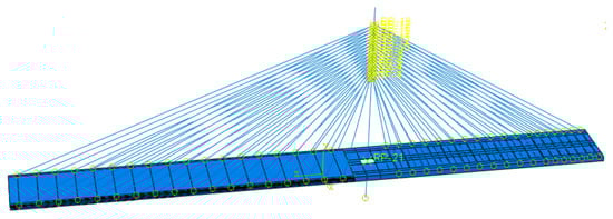 The tower and stayed cables are simulated using beam and link elements, respectively. The main beam, deck slab, and cross beam are simulated using solid elements. The slip between the steel girder and the concrete slab can be ignored. Connections between the deck–main beam and the main beam–cross beam are simulated using binding. Consolidation connections are set among the tower, beam, and pier. The tower bottom is restrained under consolidation, and the other supports are vertically restrained. The stayed cables are prestressed using the cooling method according to the completed cable force in the design.