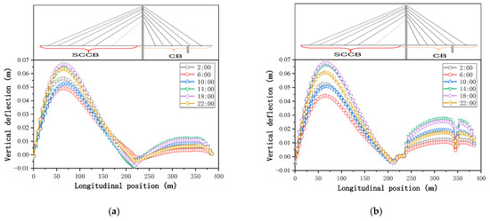 The steel girder arched upward, as shown in Figure 7a, because of the action of the temperature gradient, with a maximum value of 0.066 m at the 3/4 span of the SCCB part from the tower. The deflection reaches the maximum value at 18:00, and it falls to the minimum value at 6:00. The deformation amplitude of the CB affected by the temperature gradient is significantly lower than that of the SCCB. Under the action of the temperature gradient, the concrete decks also show upward deflection (see Figure 7b). At 6:00, the deflection value is the smallest, which is basically concentrated near 0.003 m. At 14:00, the deflection value reaches 0.012 m. Due to the constraints at the bridge tower, the deflection at the bridge tower is 0.