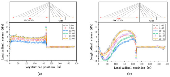 The stress distribution of the east web changes obviously with time under the action of sunshine (as shown in Figure 8). The east web is first exposed to sunshine in the morning. Then, the sun gradually moves westward over time. The longitudinal stress reaches its greatest at night, with a sudden change at the joint of the SCCB and CB. At 10 a.m., the longitudinal stress of the SCCB is about 4 MPa, which is significantly lower than at other times. Therefore, it can be inferred that under the action of the temperature vertical gradient, the longitudinal tensile stress of the steel girder decreases and the compressive stress increases.