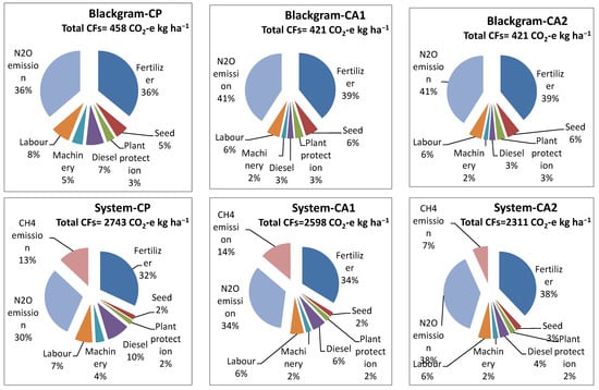 | Carbon footprint (CFs, CO2-e kg ha−1) | CP | 1670 a | 615 a | 458 a | 914 a | 2743 a |