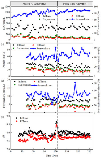 Pollutant removal and pH variation of the AnDMBRs: (a) COD removal; (b) protein removal; (c) polysaccharide removal and (d) variation in pH.