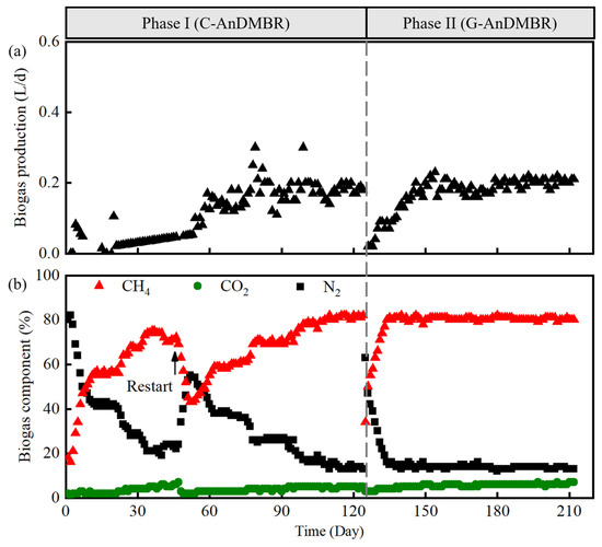 Biogas production of the AnDMBRs: (a) biogas production and (b) biogas composition.