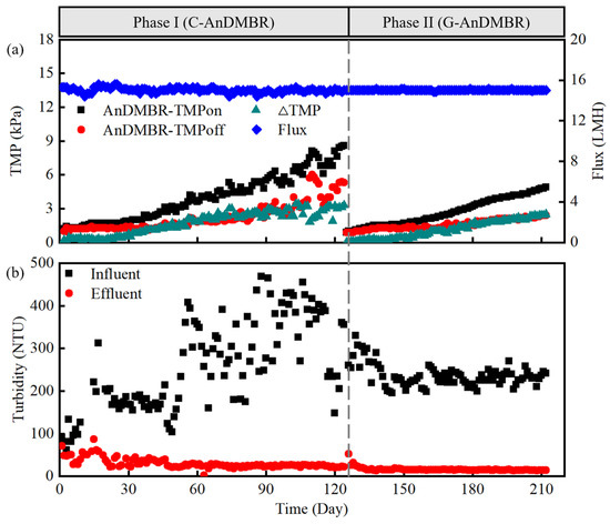 Filtration performance of the AnDMBRs: (a) the variation of TMP and flux and (b) the variation of turbidity.