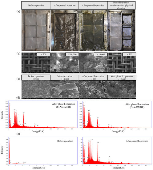As shown in Figure 4d, an EDX analyzer was used to analyze the components and content of the inorganic elements in the DM layer. The elemental composition was basically the same, but the main element, C, of the C-AnDMBR was 65.65%, while the content of the G-AnDMBR decreased to 50.07%. It was noted that the DM layer in the C-AnDMBR contained the elements Al (1.82%), P (1.82%), S (0.98%), K (0.11%), Ca (1.50%) and Fe (0.32%), which were higher compared to those of the G-AnDMBR. A recent study reported that Al, K, Ca and Fe can bridge biopolymers and cells, making the cake layer thicker [41]. At the same time, the interaction among C, Fe, P and S made their content increase together [42].