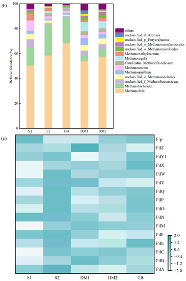 Figure 5b shows the changes in the archaea communities at the genus level in the five samples, namely S1, S2, GB, DM1 and DM2. Methanothrix (also known as Methanosaeta; S1, S2, GB, DM1 and DM2 of 50.5%, 58.7%, 68.6%, 54.3% and 57.7%) was found to be the main methanogen, indicating that acetoclastic methanogenesis was the dominant pathway. Compared with S1 (14.5%), the relative abundance of the hydrogenotrophic methanogens in S2 (Methanobacterium: 24.8%) increased because the proportion of Spirochaetes, whose products were H2 and CO2, increased [46]. In addition, Candidatus_Methanofastidiosum appeared in S2 (2.6%) and the GAC-biofilms (1.9%), possibly because the GAC provided a suitable environment for the growth of the methylotrophic methanogens. Compared with the sludge samples, the proportions of Methanothrix in DM1 and DM2 were similar; meanwhile, the proportions of Methanobacterium (14.5%, 24.8%, 20.6%, 4.5% and 6.4%) declined, and the proportions of Methanoregula (0.2%, 1.6%, 0.2%, 7.3% and 6.1%) increased.
