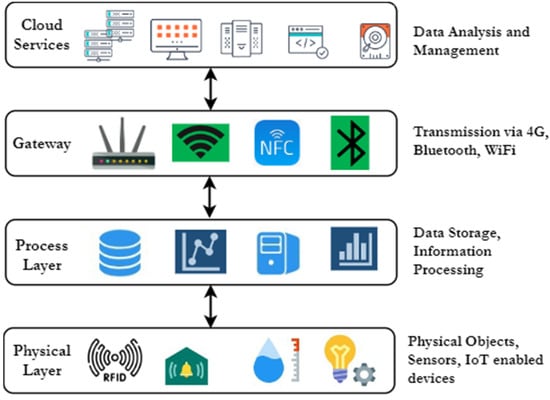 Internet of Things (IoT) is a network of physical and digital things that can be uniquely identified online. It is equipped with software, sensors and other technologies that connect to other appliances and exchange information with them. It analyses data and develops methods utilizing smart technology, Radio-frequency identification (RFID) [1], sensing apparatus and other technological breakthroughs. RFID tags track automation systems via radio frequency to search, identify, track and communicate with people. IoT can be enhanced by using some additional complementary technology advancements to close the gap between the real and virtual worlds [2,3]. Figure 1 depicts the cloud-based IoT architecture with four different layers. This architecture consists of a physical layer, a gateway layer, a process layer and cloud services layer. RFID, sensors, actuators and IoT enabled devices are used in the physical layer that collects data from the devices that are linked to the system. The process layer attempts to analyze the data obtained. The gateway layer connects sensors and IoT devices to cloud and manages network data through 4G, WiFi, etc. The most significant aspect of architecture based on cloud is a feature of cloud computing. It is in charge of carrying out the data gathered from users and industries for utilizing data algorithms for data analysis.