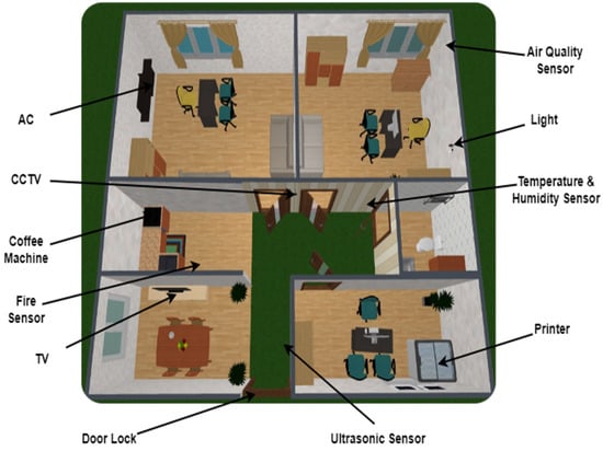The fault prediction recommender model (FPRM) monitors real-time data retrieved from various devices and sensors and predicts faults at an early stage [44]. The model’s layout includes three office rooms, one washroom, one waiting lounge, and one pantry. A 3D layout of office environment created with the Planner 5D tool having sensor distribution is depicted in Figure 2.