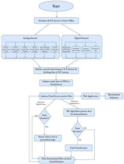 Figure 3 depicts a flowchart of the operations carried out in the proposed system step by step. To start, all of the smart devices in the office are activated and their data is sent to the Arduino platform, an open-source electronics platform based on easy-to-use hardware and software able to read inputs as light on a sensor, a finger on a button and turn it into an output such as activating a motor. Arduino controls both the analog and digital sensors used to collect data, by retrieving data and transmitting it to a cloud server [49] via a Wi-229 Fi unit. If data from an analog sensor is received at the server end, it will be processed by a machine learning algorithm to predict faults [50]. If a fault occurs, the fault classification process is initiated; otherwise, the data is saved in a cloud database. Digital sensor data is also checked for errors and if one is found, an error message is displayed on the web application [51,52]. After inspecting analog and digital sensors for faults [53], a final accumulated dataset is saved on the cloud database and data is sent to a web application that recommends solutions [54].