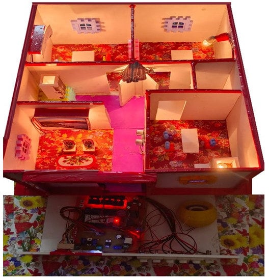 - Rout, K.K.; Mallick, S.; Mishra, S. Design and implementation of an internet of things based prototype for smart home automation system. In Proceedings of the 2018 International Conference on Recent Innovations in Electrical, Electronics & Communication Engineering (ICRIEECE), Bhubaneswar, India, 27–28 July 2018; pp. 67–72. [Google Scholar]