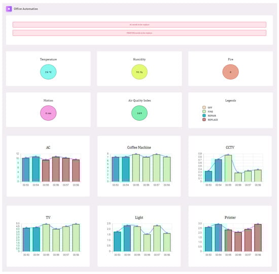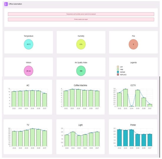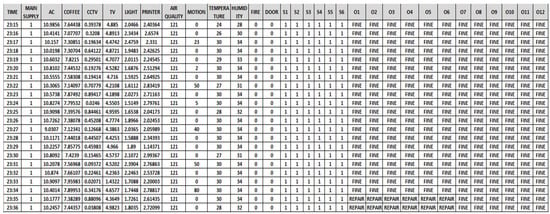 To track the real-time values of sensor data, the JavaScript framework is used for data visualization. With the help of the proposed system, users may keep an eye on the status of their appliances and get a warning when something is wrong as shown in Figure 5. The colors shown in the figure define the status of the device. The green color symbolizes working fine, blue means need to repair and red means need to replace. In this, the recommendations are also given according to the values received by the sensors and devices. The values of temperature, humidity, air quality, fire and motion sensors are represented in the application. A total of four cases are there, namely, working fine, can be repaired, needs replacement and main power supply off. If the values remain out of bounds for less than 20 iterations, then it comes under a repair case, otherwise, a replace case. The values are recorded to send the output in one of the above cases which are represented by the application and the user is informed regarding the same. IoT-based sensors transmit information to a cloud server where a machine learning algorithm is used for forecasting errors. The errors are immediately sent to the monitoring system which notifies the user via a web application. In a smart office, IoT-based sensors and appliances are placed and their data is sent to the server every second. Figure 6 depicts the image of the dataset created to determine the state of devices at each and every instance.