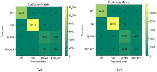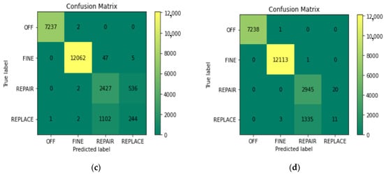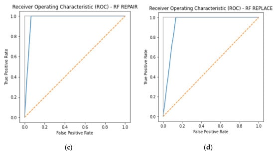 ROC curves for four different classes of Random Forest classifier. (a) “OFF” class-ROC curve; (b) “FINE” class-ROC curve; (c) “REPAIR” class-ROC curve; (d) “REPLACE” class-ROC curve.
