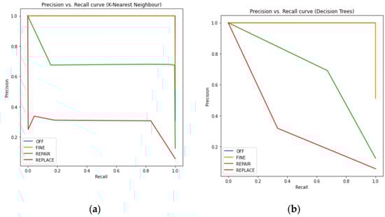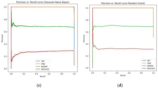 In our dataset there was a significant class imbalance as the non-faulty cases were much greater than the faulty cases and that the precision and the recall metrics were calculated using true and false positive values. The Precision-Recall (PR) curve was used to visually compare the classification models whereas a ROC curve was unable to show the differences between several methods. In a PR curve, precision is represented on the y-axis and recall is represented on the x-axis and the accuracy is maximized and said to be the most if the precision as well as the recall values are closest to ‘1’. The PR curves for RF, KNN, DT and GNB are shown in Figure 9, respectively.