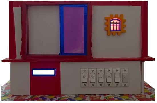 The prototype is constructed using the board and assembled using glue in accordance with the arrangement of sensor distribution in the form of a 3D design placed in a smart office (as shown in Figure 2). Following the prototype design, the model is filled with electrical devices, sensors and furnishings. On the model, there are a few switches that can induce a device error. A sliding door equipped with an ultrasonic motion sensor is used to open and close the main entrance door. This motion sensor, which is located on the door, recognizes human motion. The complete model and circuit diagram for the proposed model, which is used in a smart office to continuously check device status and performance, is shown in Figure 4.