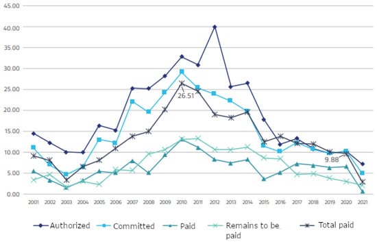 Federal public investment in transport infrastructure—2001 to 2021 in BRL billion [38].