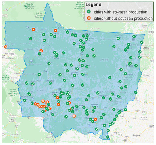 The case study begins with analyzing the soybean production scenario involving all 141 cities in the state of Mato Grosso, the largest soybean producer in Brazil. Of all the municipalities, 121 locations produced soybeans in 2020, with around 65% of all production destined for export [69]. Therefore, without loss of generality, each of the 121 cities in Mato Grosso that produced soybeans will have an equal contribution to the amount destined for export. Therefore, the amount of soybean that each city in Mato Grosso is destined for export is proportional to its production. Figure 2 below, created using Google Maps, shows a map with the geographic location of each soybean-producing and non-producing city in the state for the year 2020.