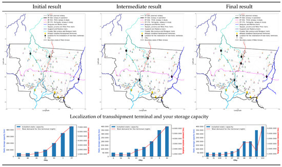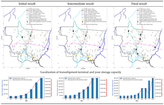 For each scenario, we show the location position of each transshipment terminal on the map and to report the results for three assumptions: no environmental concern (initial result, ), moderate environmental concern (intermediate result, ), and high environmental concern (Final result, ). Additionally, below the maps, the chart displays the static storage capacity of the terminals and the annual soybean demand destined for it. Cities are represented in numbers (full names in Table A1, Appendix A), and the configurations adopted for the weights , , , and are described below.