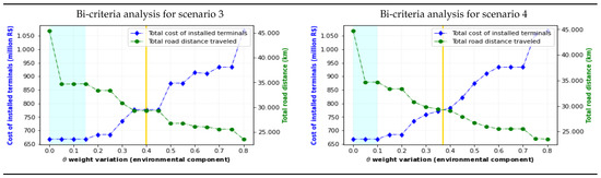 In this section, the effects of the variation in the weight of the environmental component on the cost of implementing the terminals and on the total road distance traveled are analyzed. A three-axis graph is presented to compare the economic (of the implementation cost) and the environmental commitment (with a focus on carbon emission reduction).