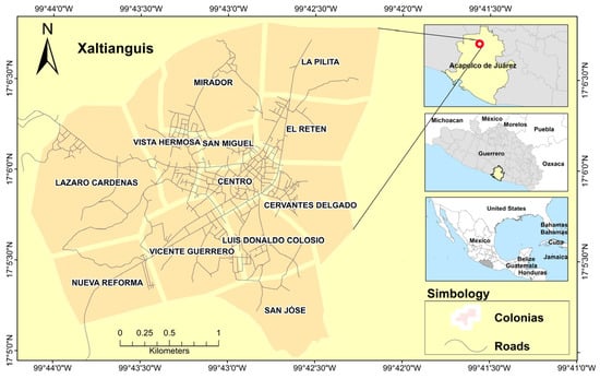 The research was conducted in Xaltianguis, a town located about forty kilometers away from its municipal administrative capital, Acapulco de Juárez, Guerrero (Figure 1). It is classified as urban because of its population size of 6564 inhabitants [22]. It is located northwest of Acapulco between parallels 17°05′58″ north latitude and −99°42′51″ west longitude of the prime meridian and at an altitude of 533 m above sea level [22]. It is considered a locality with a low social backwardness index, which measures four main indicators: educational backwardness, access to health services, access to basic services in housing, and housing quality and space [23].