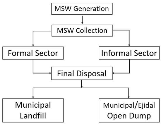 Mexican legislation establishes in Article 115 of the Mexican Constitution that municipalities are responsible for the collection of urban solid waste. The General Law for the Prevention and Integral Management of Waste and the General Law for Ecological Equilibrium and Environmental Protection derive from this law, which establishes actions related to waste management that must be adapted to the conditions and needs of each place and allow compliance with Mexican Official Standards to achieve the objectives of valorization, and sanitary, environmental, technological, economic and social efficiency [8,9].